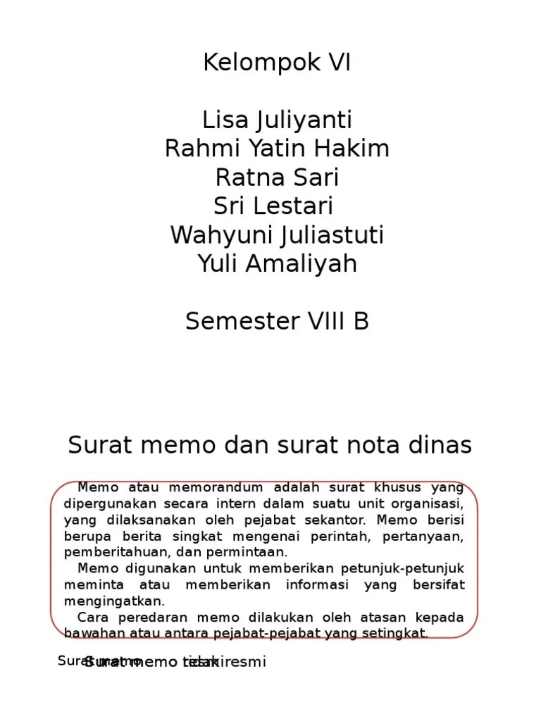 Inilah jenis surat dinas yang sedang kita pelajari bersama. Memo tidak resmi dipakai sebagai nota atau surat pernyataan tidak resmi antar teman, saudara,. Memo atau nota dinas merupakan salah satu surat . Atau surat pernyataan dl hubungan diplomasi; Memo berasal dari kata memory yang berarti pengingat .
